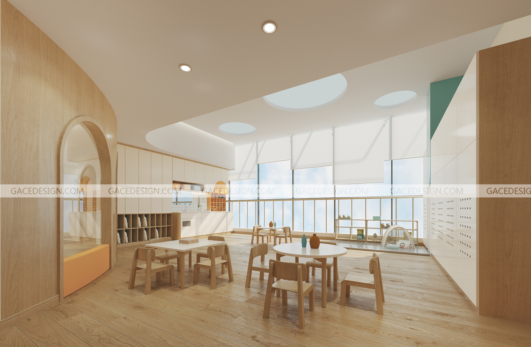 設(shè)計概括:作為浙江省臺州&嘉興市的第一批示范性且根據(jù)托育設(shè)置標(biāo)準(zhǔn)建設(shè)的盈利性高端托育園,總面積700&1000平。我們把設(shè)計重點(diǎn)放在了教育理念和兒童心理層面上??臻g中除了功能性,以滿足孩子們的日常食宿,需要更多的可拓展性。場地為純粹的室內(nèi)空間,而幼兒天性的釋放往往在戶外。如何將戶外元素與功能性結(jié)合,我們想到用建筑思維來解構(gòu)空間,讓空間立體而生動。結(jié)合陳鶴琴老先生的教育理念,我們在室內(nèi)設(shè)計了富有親和力、天然感的兒童探索洞穴和一條無邊界的跑道。
