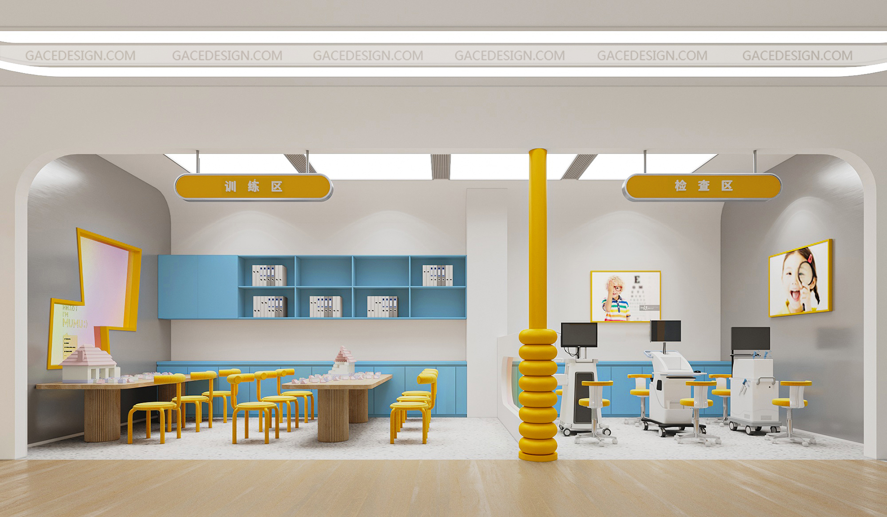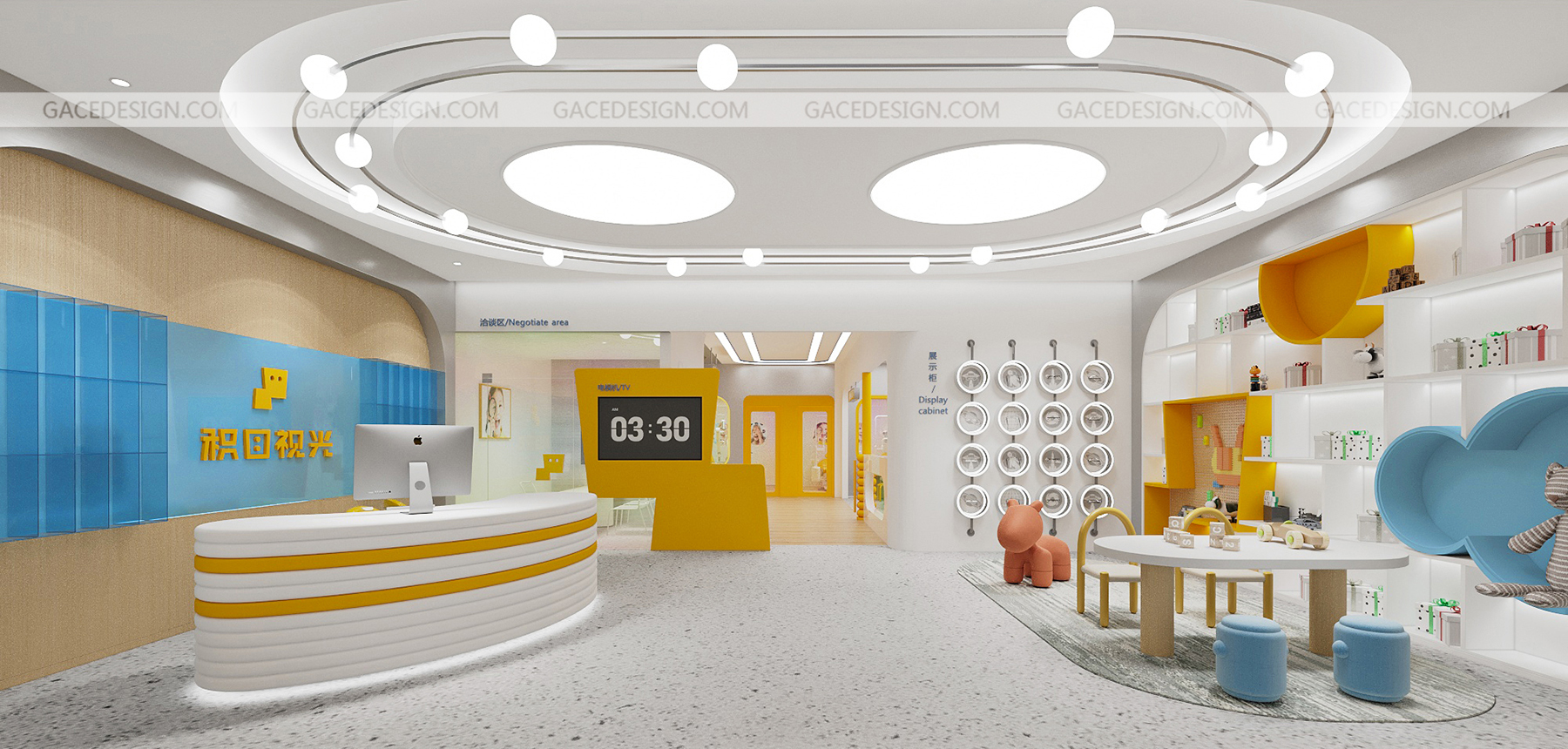 設(shè)計(jì)說明:將品牌IP最大化融入到空間。以鮮明的品牌形象色,傳達(dá)了引領(lǐng)行業(yè)趨勢的新理念。友好的圖形具象化,強(qiáng)烈的對比色在市場打出差異化。讓整個(gè)場景與兒童體驗(yàn)起來更生動有趣。,所有的尺寸根據(jù)兒童的人體工學(xué)進(jìn)行搭配。每一個(gè)小細(xì)節(jié)都對兒童友好。一切都是圓的,沒有可以撞到的角落。