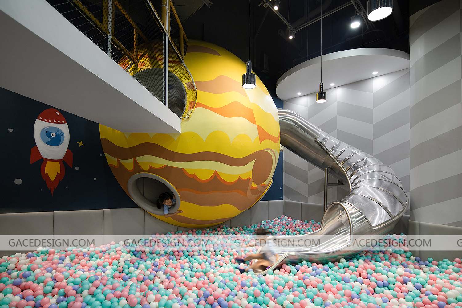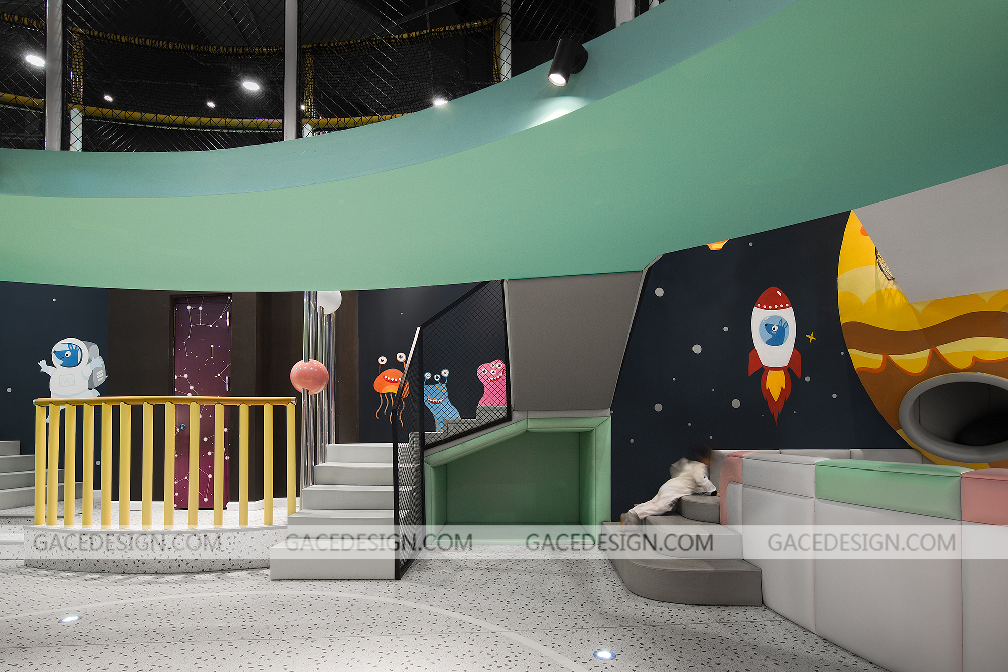 設(shè)計(jì)師將游樂場(chǎng)主題定為“未來(lái)星球”,以“未來(lái)”作為設(shè)計(jì)方向,以“星球”做為設(shè)計(jì)的核心。各種體量的“星球”在太空中穿行,打造出豐富多彩的星球世界。設(shè)計(jì)師根據(jù)孩子的冒險(xiǎn)精神設(shè)定多種游戲玩法和路線,孩子進(jìn)入游樂場(chǎng)后,首先需要了解故事背景,在置身其中不斷迎接挑戰(zhàn),最終完成“拯救家園”的任務(wù)。整個(gè)游樂場(chǎng)分為前端接待區(qū)、中端靜態(tài)游戲區(qū)、后端動(dòng)態(tài)游戲區(qū)。