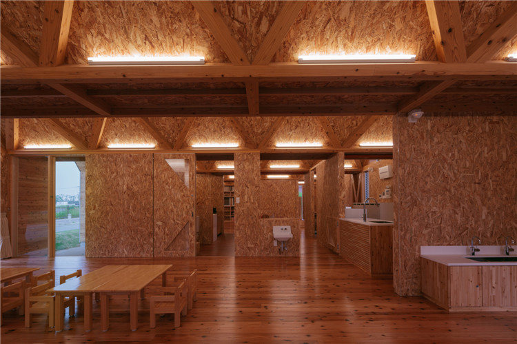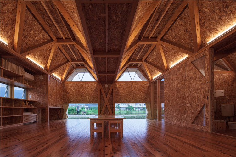 屋頂結(jié)構(gòu)采用折疊板設(shè)計,無柱空間是通過運用木桁架梁屋頂結(jié)構(gòu)實現(xiàn)的,形狀像一塊折疊板。所有支撐屋頂結(jié)構(gòu)的承重墻都被布置在建筑外圍。現(xiàn)在這座建筑分成了兩個保育室、衛(wèi)生間等,但將來也可以轉(zhuǎn)換為一個大房間。