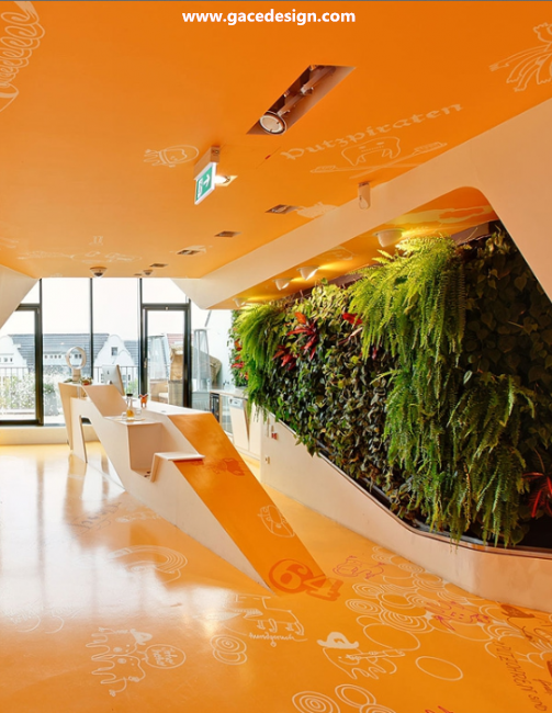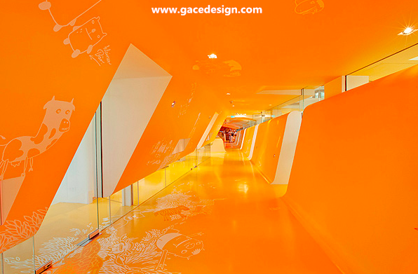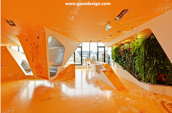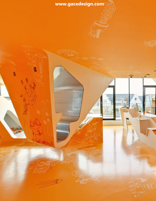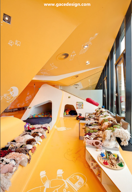 整個KU65 Kids Club的內(nèi)部顏色選用來鮮亮的橙黃色與白色搭配,所有被“切開”的斷面皆為白色。桔黃色的表面上印有各種有趣的卡通圖案與涂鴉,甚至還有類似攀巖的墻壁。很難想象這里竟是一家醫(yī)療保健機構,所以項目名為KU65 Kids Club就容易理解了。幼兒園設計