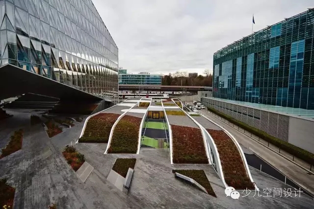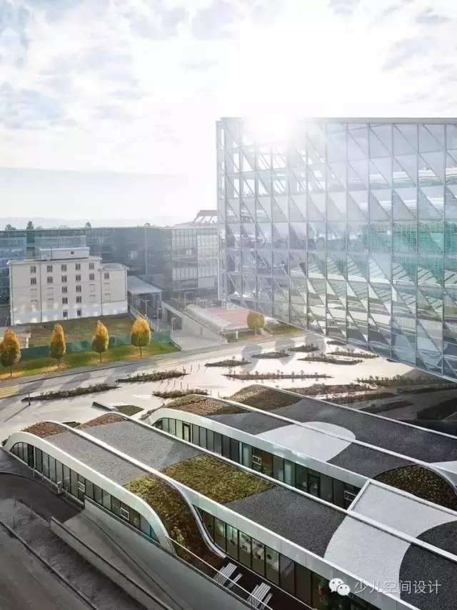 這片兒童區(qū)域與日本國(guó)際煙草公司日內(nèi)瓦分部相連。位于日本國(guó)際煙草公司與世界氣象組織這兩個(gè)大體量構(gòu)筑物之間的幼兒園,被定位為具有功能的景觀建筑。