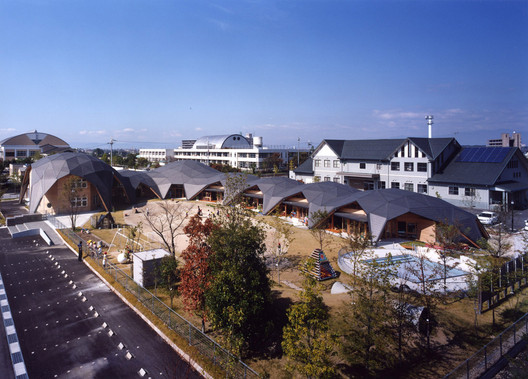 maihara幼兒園它位于日本滋賀縣,它的周邊都是一些新建的住宅區(qū)?;炷恋暮凶佑蛇B續(xù)的木頭屋頂鏈接為一體,屋頂用連續(xù)的三角形的平面構(gòu)成;它的結(jié)構(gòu)的強(qiáng)度和形狀的連續(xù)性有很大的自由度。屋頂使用2.5米長的木梁和六角形的金屬(接頭)配件,工廠預(yù)制,現(xiàn)場裝配。木制桁架和混凝土盒子組合出各種各樣的結(jié)構(gòu)表現(xiàn)效果。