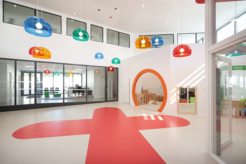 法國的一個(gè)育兒中心兒童空間,其設(shè)計(jì)非常有意思其特色是上面裝飾著不相同的顏色,和不同的類型玩具相似。