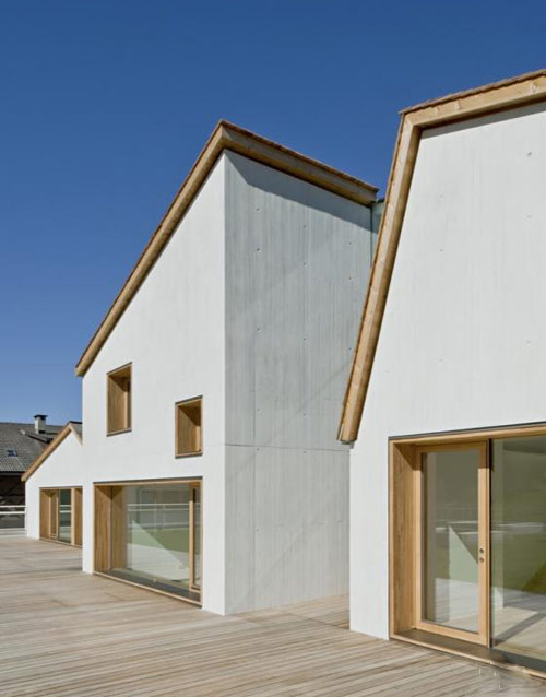 建筑外墻都是雙層的,暴露的的白色混凝土;結構采用木制構架。屋頂采用手切的松木屋面板瓦。 較低地坪的大開窗周圍覆蓋以豎向松木板。入口空間也采用暴露的混凝土,清晰的描繪出建筑結構。僅僅在畫廊層采用了木頭。窗口帶來的不同景致,將群山景色送入眼簾。較低地平層的教室有近80平方米,是三個教室中最大的。以清晰、簡潔的線性設計。(幼兒園設計)