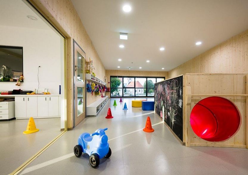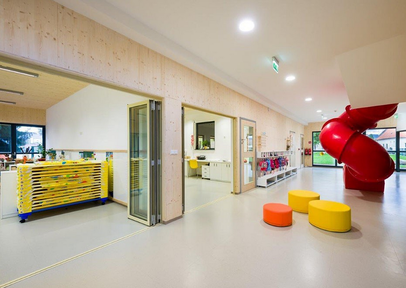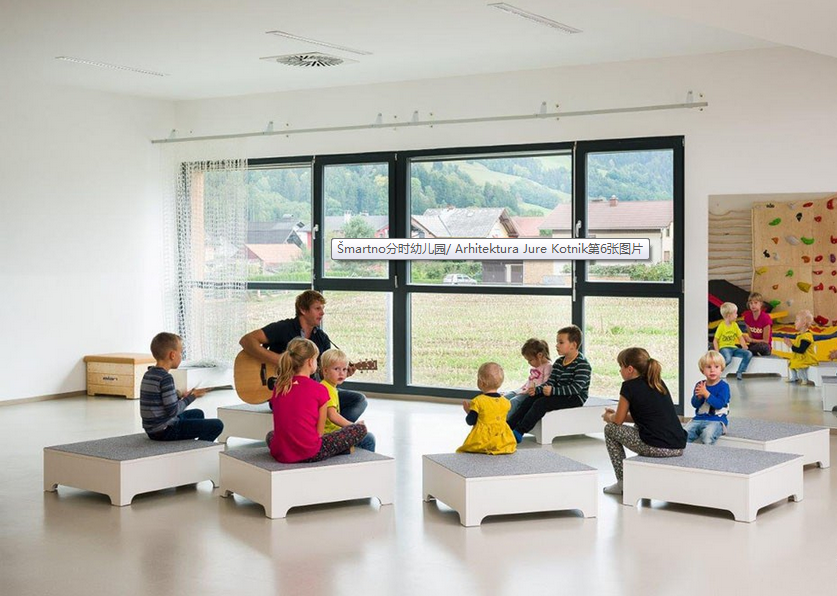 斯洛文尼亞的?martno分時幼兒園是低能耗房屋。幼兒園室內(nèi)設(shè)計的是采用木材裝飾,所有墻面的木材都是當?shù)厝〔模@也確保了可持續(xù)建筑的最高標準。建筑十分緊湊,所有的建設(shè)工作包含操場,都僅在四個月內(nèi)完成,北向幾乎沒有開口,南立面則全部對外開放。