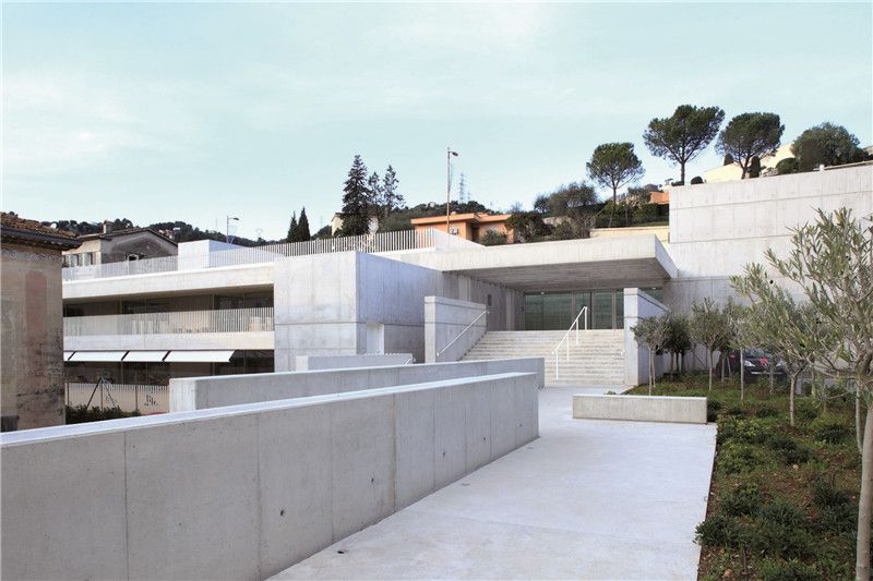在法國(guó)的一家托兒中心名為L(zhǎng)a Trintite兒童日托中心,這間托兒中心的位置非常有趣,是在公墓和一座購(gòu)物中心中間的一個(gè)花園深處,建筑在場(chǎng)地中的植入,連通周邊環(huán)境,為整個(gè)小鎮(zhèn)創(chuàng)造了一個(gè)新的物理連接——形成一個(gè)連接上部和下部道路的公共通道。受到經(jīng)濟(jì)要素的現(xiàn)實(shí),我們限制了挖掘量,因此將停車(chē)場(chǎng)放置在屋頂上,這樣地面空間也可以被塑造成為新的公共空間。兩層樓底板挑出了3米的寬度,以保護(hù)操場(chǎng)不受到太陽(yáng)的直曬。這些水平層面要素的設(shè)計(jì)平衡了結(jié)構(gòu)性的垂直框架,并且容納了日托中心的所有功能要素需求。