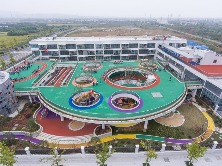 在浙江湖州長(zhǎng)興縣龍山街道的中心幼兒園,在十月十七日正式開(kāi)園,這是一個(gè)投資八千萬(wàn)元占地十九畝的幼兒園,據(jù)了解這個(gè)幼兒園的設(shè)計(jì)理念是來(lái)源于日本,在日本富士有個(gè)幼兒園和空山中心幼兒園一樣都是在郊外建設(shè)的,因?yàn)橥恋赜邢薜菍W(xué)生們還是需要一個(gè)可以給學(xué)生運(yùn)動(dòng)的的操場(chǎng),為了解決這個(gè)場(chǎng)地不足的問(wèn)題所以設(shè)計(jì)師還講操場(chǎng)跑到設(shè)計(jì)到了屋頂,做成了一個(gè)環(huán)形結(jié)構(gòu),之所以要這樣設(shè)計(jì)是因?yàn)楹⒆拥倪\(yùn)動(dòng)規(guī)律是特別喜歡跑圈。
