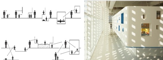 設(shè)計師首先考慮到兩種身高帶來的視角區(qū)別。因此在兒童內(nèi)部空間中設(shè)計一些專供兒童使用的低矮空間。就如同我們小時候爬假山的山洞,或者拿沙發(fā)墊子搭的城堡。另一方面父母還必須負(fù)起監(jiān)護的職責(zé),所以主要活動室的設(shè)計升高到成人目光可以透過窗子平視的高度。這樣就更有利于家長觀察孩子的動向,設(shè)計師最終在大空間內(nèi)部搭起一系列“小盒子”。呈現(xiàn)出升高的教室,供家長窺視的小窗,還有盒子底下只有孩子才能鉆過去的通道。我相信小孩們總會對這種特別的兒童空間設(shè)計感到興奮和安全感。