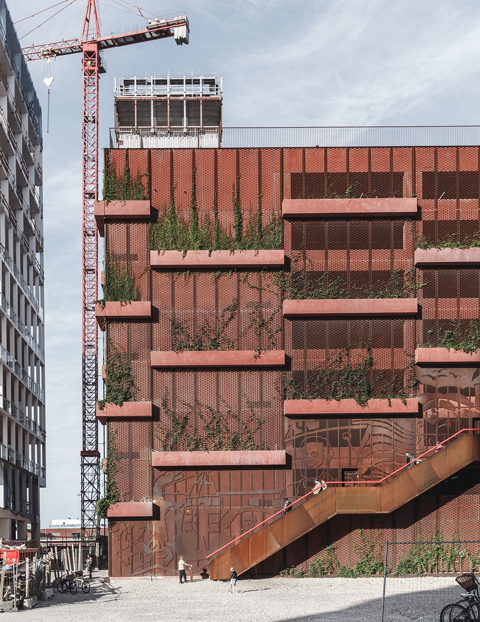 設(shè)計師沒有遮掩而是希望以暴力的結(jié)構(gòu)打破立面,樓層的外部掛著一系列的種植槽,和建筑的結(jié)構(gòu)相呼應(yīng),在給人們創(chuàng)造適宜的空間的同時也把綠色帶到了每個角落,兩條巨型樓梯穿插其中,樓梯之上采用鋼制扶手防護延綿而上,而轉(zhuǎn)到屋頂之后則是轉(zhuǎn)化為秋千、攀爬架、單杠等等面向各個年齡階層的運動游樂設(shè)施,創(chuàng)造出一個活力十足的公共空間。