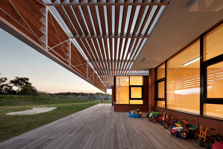 屋頂的設計和開放活動室形成一個新的介于內部與外部之間的空間。通過在南北方向的單位位移,在活動室之間形成了視覺連接效果。這個專門為幼兒園設計的活動室完全可以融入教學工作中。