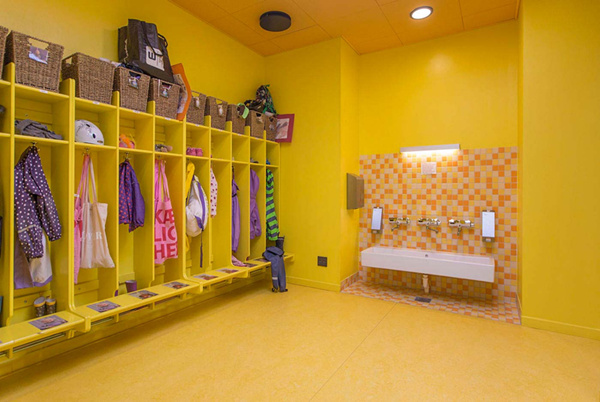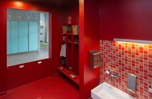 其幼兒園室內(nèi)設(shè)計“宛如一個珠寶盒”:在整個幼兒園的內(nèi)部都是繽紛的色彩、復(fù)雜的圖案和不同的肌理愉悅了孩子們的身心。同時裝飾有色彩、圖案豐富的壁紙和瓷磚。建筑如同一個大型的珠寶盒,這能夠喚醒孩子的好奇心,培養(yǎng)孩子們的探索精神,而且還為孩子們創(chuàng)造出五彩的內(nèi)部空間和趣味十足的游樂場供孩子們玩耍嬉戲,有趣的活動空間設(shè)計讓孩子們的由著足夠是運動量。雖然平面布置十分復(fù)雜好似迷宮,但不同的色彩便于人們辨別方向。