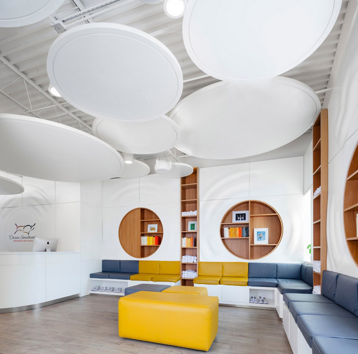 ▼明亮通透的舞蹈教室兩間舞蹈教室打通形式一個巨大舞臺嵌入式儲物柜,鮮艷的顏色給人以充滿活力的感覺