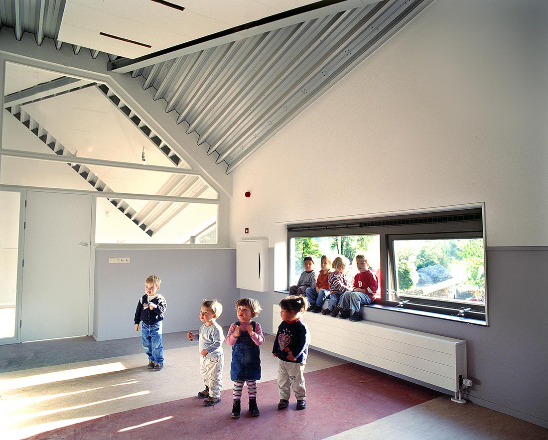 這座建筑有種異域般的永恒之美——他像一個(gè)即現(xiàn)代又古老的農(nóng)舍,鋁制的現(xiàn)代屋頂與質(zhì)樸的的木質(zhì)材料形成對(duì)比,產(chǎn)生獨(dú)特的視覺效果。室內(nèi)空間寬敞??臻g內(nèi)傾斜的視角也許對(duì)成年人而言是十分奇怪的,但是對(duì)兒童而言完全符合他們的天性。它激發(fā)了兒童的情感——一種孩子們不炫耀、不張揚(yáng)的行為需要。