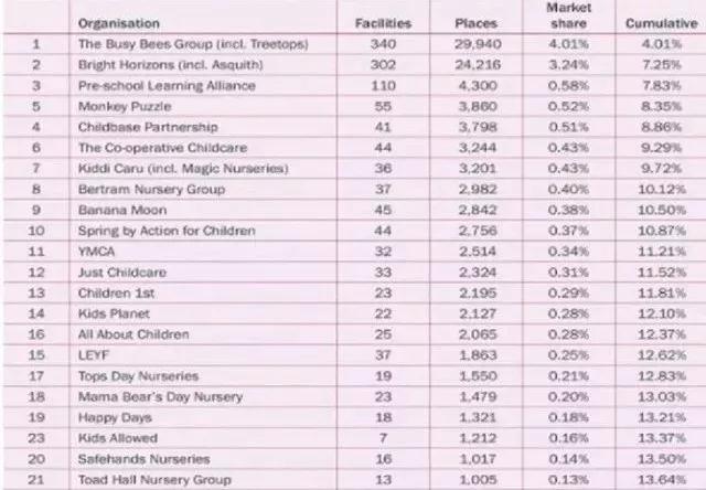 再來(lái)講一講,英國(guó)早教市場(chǎng)的育化。下圖是2018年英國(guó)早教市場(chǎng)前21名:(英國(guó)義務(wù)教育從4歲開(kāi)始,0-4歲的保育階段已經(jīng)高度市場(chǎng)化)