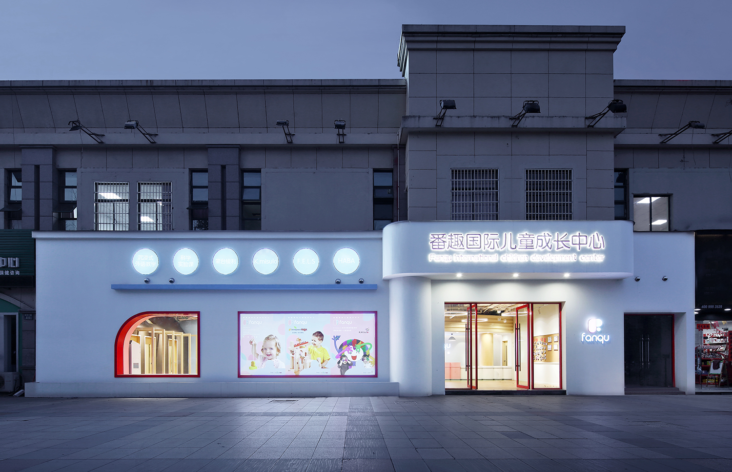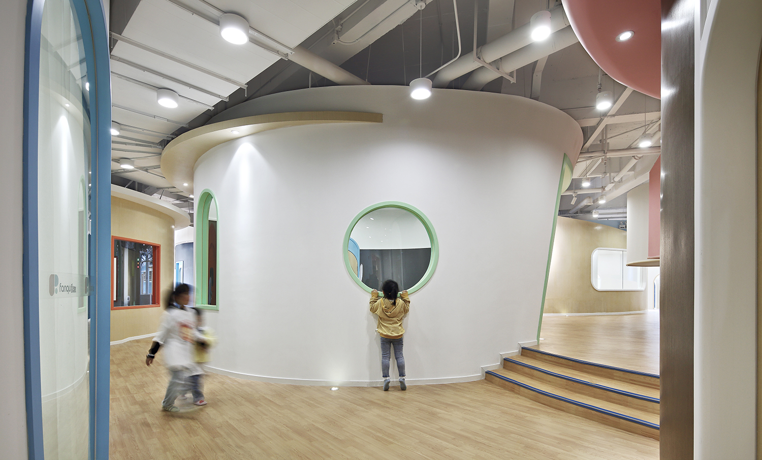 設(shè)計(jì)師延伸“番趣”的品牌形象,打造項(xiàng)目主入口外觀,品牌元素與園區(qū)的展示需求相融合,構(gòu)成明凈活潑的外觀形象。門(mén)頭和前臺(tái)造型取自品牌“F”元素,以親切的姿勢(shì)歡迎小朋友和家長(zhǎng)的到來(lái)。