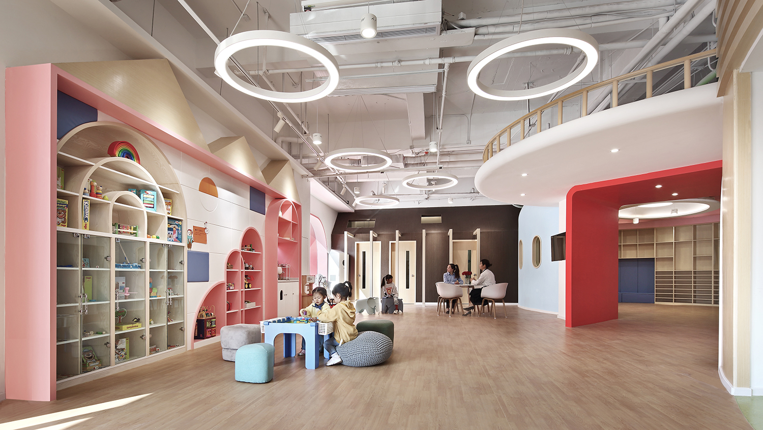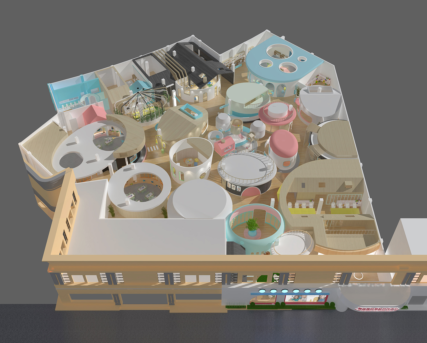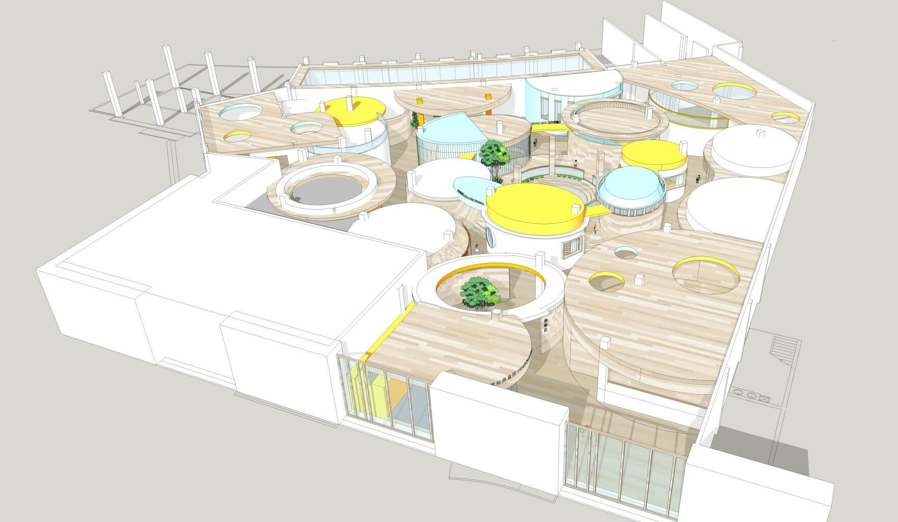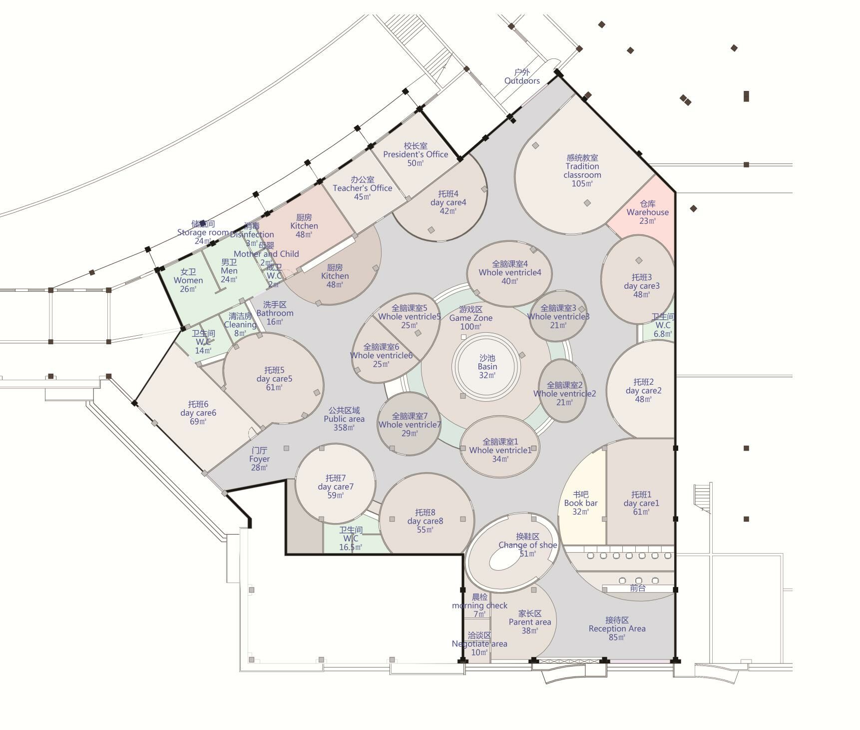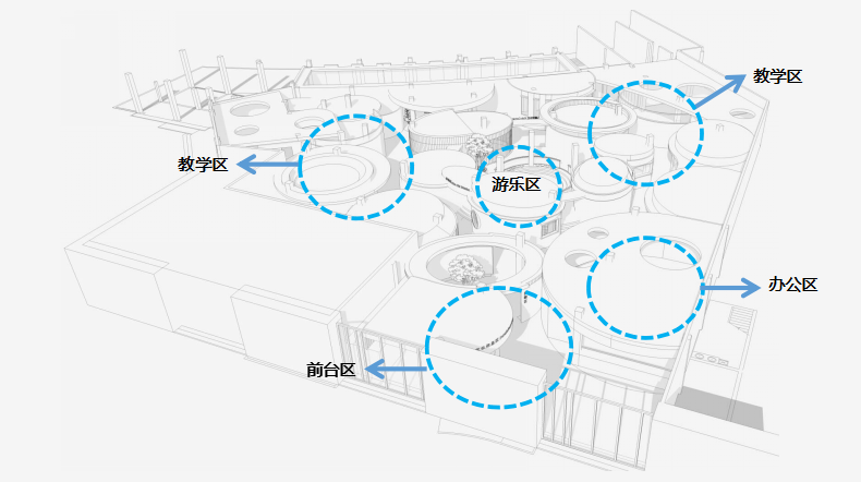 此次設(shè)計(jì)涉及早教和托育兩大版塊功能需求,包括16間教室、1個(gè)游樂(lè)區(qū),以及書(shū)吧、辦公區(qū)、廚餐區(qū)等。設(shè)計(jì)師將原有場(chǎng)地進(jìn)行清理和重新分割,根據(jù)項(xiàng)目需求和場(chǎng)地情況將中部規(guī)劃為早教區(qū),托育教室則圍繞早教區(qū)環(huán)形安置,主門(mén)在南面,接送門(mén)在西側(cè)。