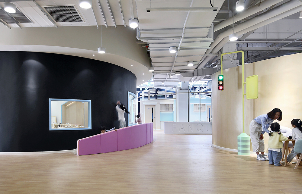 場(chǎng)地總面積有2000㎡,充分的條件讓我們能夠?qū)ⅰ俺鞘薪ㄖ边@個(gè)宏觀的概念和很多設(shè)想落地。如果將番趣兒童成長(zhǎng)中心看作一座城,我們?cè)撛鯓尤ゴ罱ǔ鞘校?/span>