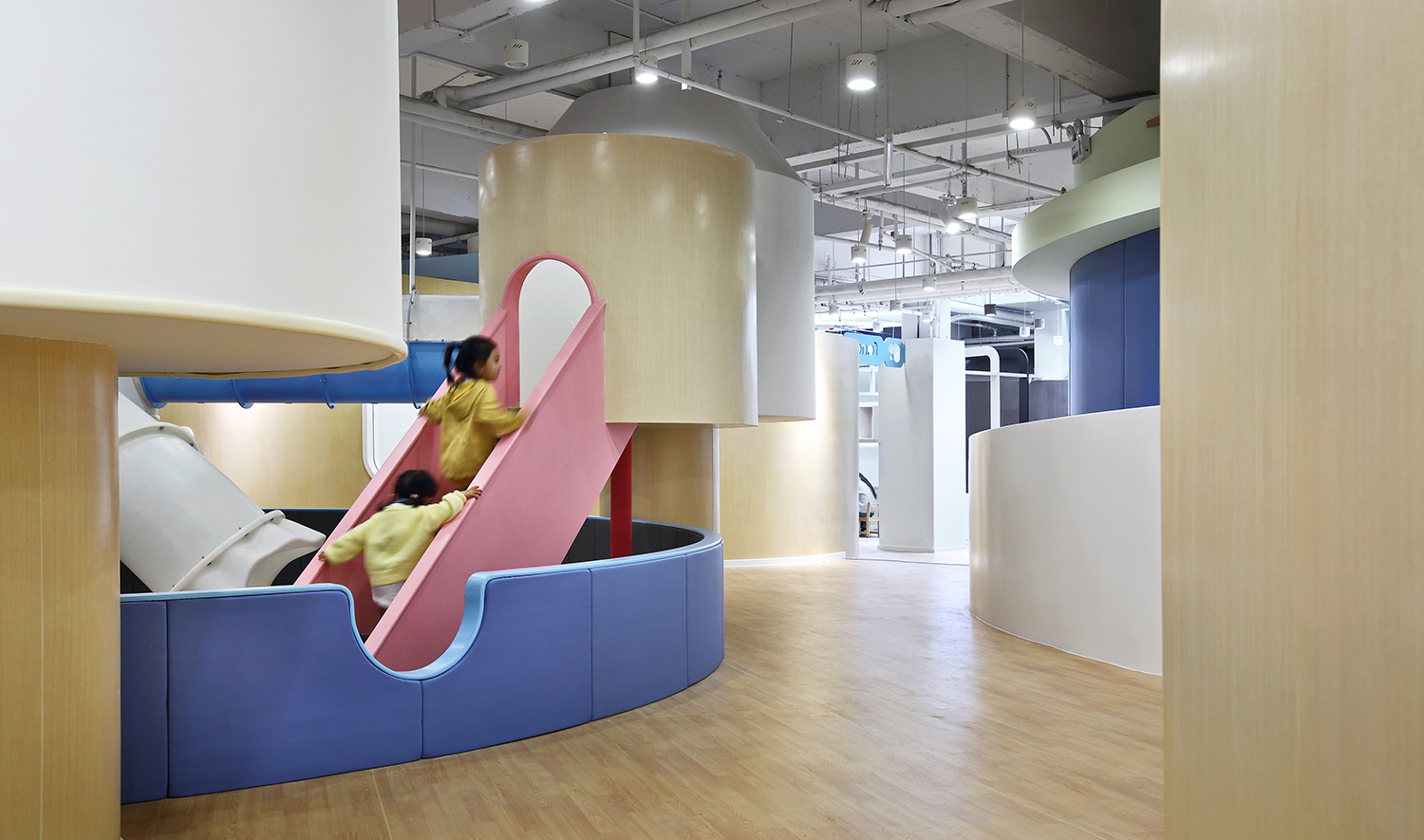 游戲是孩子的活力之源,也是孩子通往世界的途徑。設(shè)計(jì)師將游樂(lè)區(qū)布局在室內(nèi)的中心位置,讓孩子的歡聲笑語(yǔ)激活整座“城”。孩子們會(huì)帶著好奇和期待爬上梯子,穿過(guò)可愛(ài)的小木屋,在管道中匍匐前進(jìn),然后“咻”地一下滑入下沉的球池,在不斷變化動(dòng)作和愉悅的體驗(yàn)中獲得身心的鍛煉和能力的發(fā)展。