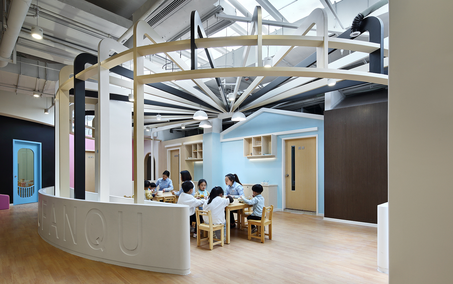 FANQU番趣國(guó)際兒童成長(zhǎng)中心是一座結(jié)合當(dāng)?shù)亍爸褡印憋L(fēng)物和園區(qū)特色課程,為孩子專屬打造的微縮城市,孩子真正是城市的主角?!爸窆?jié)房子”是孩子的學(xué)習(xí)基地,而無(wú)邊界的彎曲“街道”和游樂(lè)區(qū)則啟發(fā)孩子進(jìn)行各種有趣的游戲。在這里,孩子可以自由地瘋玩,放松地交友,品嘗無(wú)限的趣味,收獲快樂(lè)的成長(zhǎng)。這里,也是孩子的另一個(gè)家。