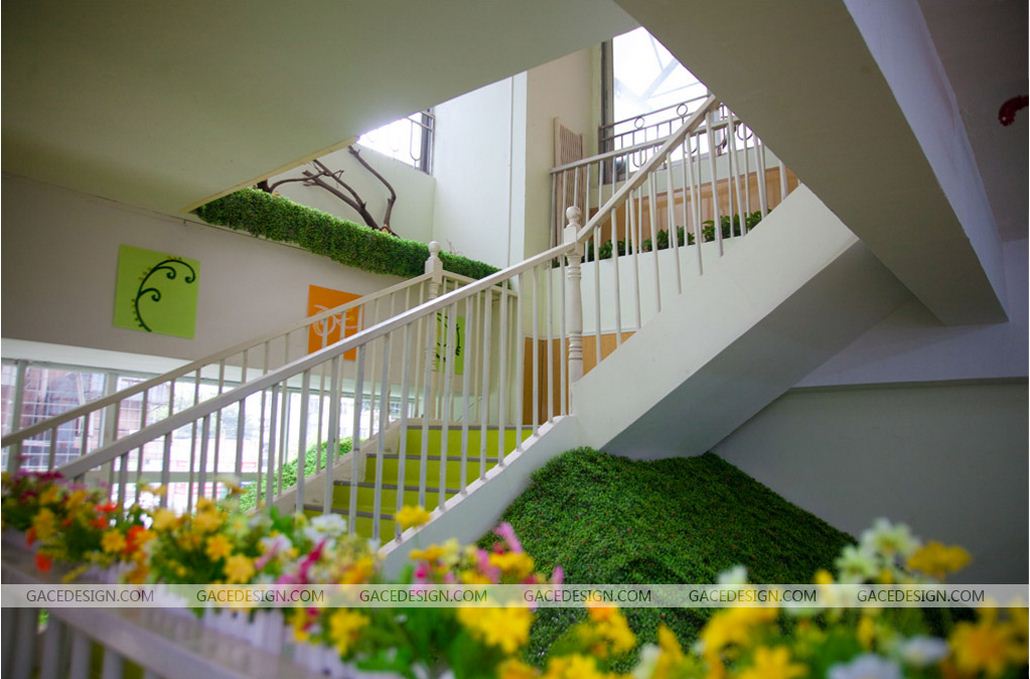 利用裝修,克服原有建筑的事故隱患,保障幼兒安全,是幼兒園裝修中特別要注意的一點(diǎn)。樓梯方面,幼兒翻越樓梯扶手或把扶手當(dāng)成滑梯玩時(shí),都有可能發(fā)生傷害事故。為避免事故發(fā)生,幼兒園一般采用掛網(wǎng)處理,手段比較單一,也欠美觀(guān)。在樓梯所形成的空間底部,用質(zhì)地較軟的杉木裝修成波波球池,樓梯的水泥側(cè)面也用杉木板包邊。萬(wàn)一幼兒翻越欄桿,身體碰撞在軟處理過(guò)的欄桿上,可無(wú)大礙,掉在波波球池里,也是軟著落,有驚無(wú)險(xiǎn)。