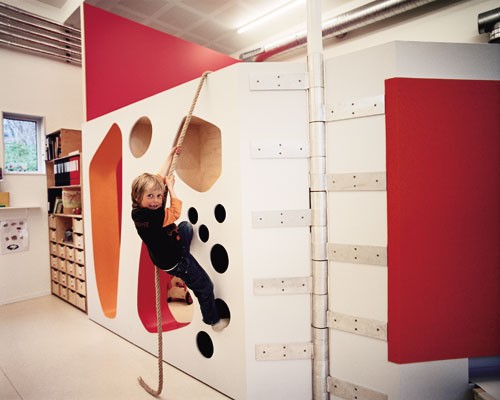 墻是Tromso幼兒園空間的核心設(shè)計元素。普通意義上僅僅承擔分隔空間與隔音作用的墻壁被賦予了更豐富的功能,或者說,家具與墻的界限變得非常模糊。簡單的折疊和推拉墻面即可改變房間的大小,創(chuàng)造出容納新功能的空間,如同童話故事中的魔法墻。墻面擁有鮮艷的色彩和不同的材質(zhì),并且開設(shè)了許多形狀大小各不相同的洞口。