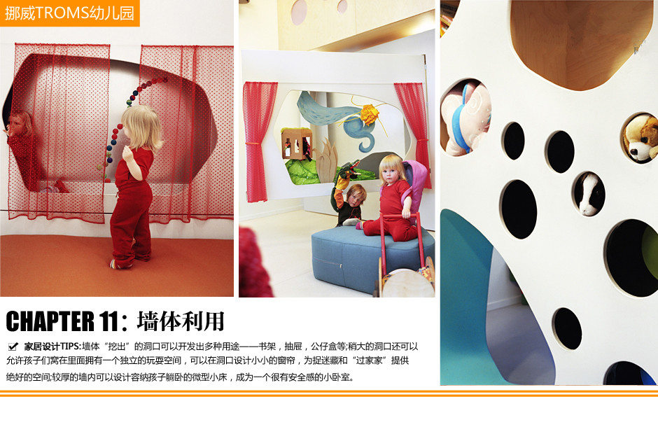 11、墻是這所幼兒園空間的核心設(shè)計(jì)元素。一般意義上,墻體只承擔(dān)分隔空間和隔音的作用,但這里被賦予了更豐富的功能?;蛘哒f,家具與墻的界限變得非常模糊。簡單的折疊和推拉墻面即可改變房間的大小,創(chuàng)造出容納新功能的空間。墻面采用不同的材質(zhì),擁有鮮艷的色彩,并且開設(shè)了許多形狀大小各不相同的洞口。